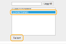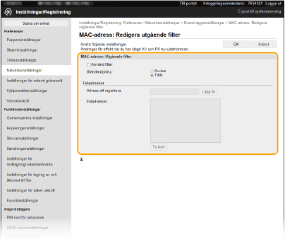 2 | Ange adressundantag. Ange MAC-adressen i textrutan [Adress att registrera] och klicka på [Lägg till]. Du behöver inte avgränsa adressen med bindestreck eller kolon. ![]() Söka efter inmatningsfel Om MAC-adresser anges felaktigt kanske du inte kan använda enheten från Fjärranvändargränssnittet och då måste du ställa in <MAC-adressfilter> på <Av>. <MAC-adressfilter> ![]() När [Avvisa] väljs för utgående filter Utgående multicast- och sändningspaket kan inte filtreras. Ta bort en MAC-adress från undantag Välj en MAC-adress och klicka på [Ta bort]. ![]() | ||||