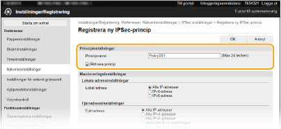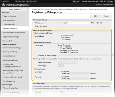 Om [Manuella IPv4-inställningar] eller [Manuella IPv6-inställningar] har valts för [Fjärradress], anger du IP-adressen som principen ska användas på. Du kan också ange ett adressintervall genom att infoga ett bindestreck mellan adresserna.