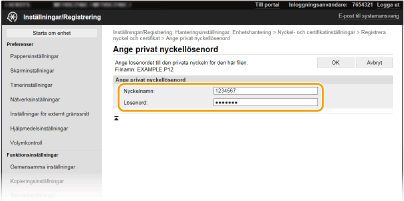 Använd alfanumeriska tecken och ange lösenordet för den privata nyckel som har angetts för filen som ska registreras.