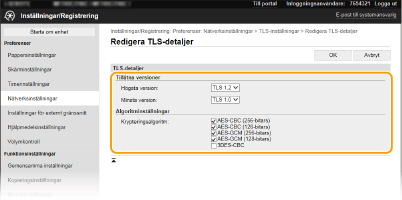 Använda kontrollpanelenDu kan även aktivera eller inaktivera TLS-krypterad kommunikation från <Meny> på skärmen Hem. <Fjärranvändargränssnitt> Starta fjärranvändargränssnittet med TLSOm du försöker starta fjärranvändargränssnittet när TLS har aktiverats kan en säkerhetsvarning visas gällande säkerhetscertifikatet. I så fall kontrollerar du att rätt webbadress har angetts i adressfältet och går sedan vidare för att öppna skärmen för fjärranvändargränssnittet. Starta Fjärranvändargränssnittet Använda TLS för att kryptera kommunikation via e-post/I-faxOm SMTP- och POP3-servern har stöd för TLS kan du aktivera TLS för kommunikation med dessa servrar (Konfigurera kommunikationsinställningar för e-post/I-fax). Mer information om SMTP- och POP3-servern kan lämnas av din Internet-leverantör eller nätverksadministratör. |