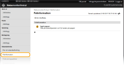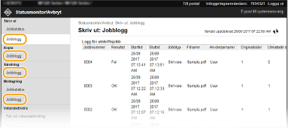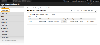 När du har loggat in i systemhanteringsläget klickar du på [Ta bort] när du vill ta bort dokument som inte har kunnat vidarebefordras. När du har loggat in i systemhanteringsläget klickar du på [Jobbnummer] när du vill se detaljerad information om eller förhandsgranska dokument som inte har kunnat vidarebefordras. |