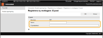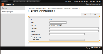 Du kan använda en dator för att registrera mottagare i enhetens adressbok samt redigera information om registrerade mottagare. Ange den delade mappen/FTP-serverdestinationen här.