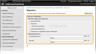 Ange ett lösenord för att kryptera exportdata med hjälp av alfanumeriska tecken. Ange samma lösenord i [Bekräfta]. Om kryssrutan [Adressbok] eller [Inställningar/Registrering] är markerad kan data inte exporteras utan ett angivet krypteringslösenord.