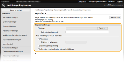 Du kan även importera/exportera inställningsdata via ett USB-minne genom att använda enhetens kontrollpanel. <Importera/exportera> |