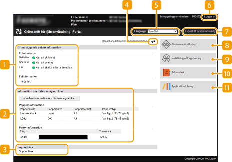 När du loggar in till fjärranvändargränssnittet öppnas följande portalsida. Det här avsnittet beskriver objekten som visas på portalsidan samt grundläggande funktioner.