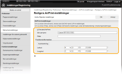 Här kan du kontrollera värdena som har angetts för AirPrint-inställningarna, t.ex. namnet och platsen för enheten. Du klickar på [Redigera] om du vill ändra inställningarna.