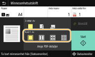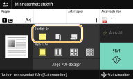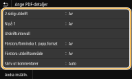 ![]() Det går att skriva ut 9 eller 16 sidor med bilddata i en PDF-fil på en sida av ett pappersark genom att använda <N på 1> under <Ange PDF-detaljer>. |