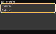 <Originaltyp> Du kan välja typ av original beroende på vilken bild som ska skrivas ut. ![]() <Prioritera foto> Prioriterar tydlig utskrift av fotobilder. <Prioritera text> Prioriterar tydlig utskrift av text. |