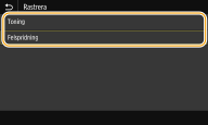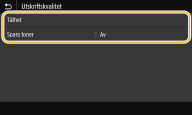 <Utskriftskvalitet> Du kan ändra inställningar som rör utskriftskvalitet. ![]() <Täthet> Justerar tätheten vid utskrift. <Spara toner> Välj <På> om du vill skriva ut i läget för att spara toner. Välj <På> när du vill kontrollera layout eller andra utseendemässiga egenskaper innan du går vidare med utskriften av ett stort jobb. ![]() När <Spara toner> är inställt på <På> visas inte <Täthet>. |