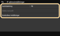 Ange en IP-adress manuellt1 | Välj <Autohämtning> och sedan <Av> i <Autohämtning> <Använd> <OK>. |