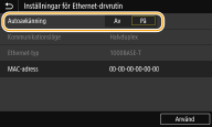 Konfigurera Ethernet-inställningar manuellt1 | Välj <Av> i <Autoavkänning>. |