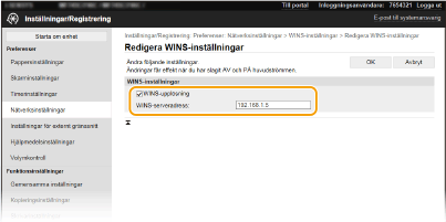 Om IP-adressen för WINS-servern hämtas från en DHCP-server, åsidosätter den hämtade IP-adressen den IP-adress som anges i textrutan [WINS-serveradress].