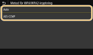 2 | Välj en krypteringsmetod. <Auto> Gör att enheten automatiskt väljer AES-CCMP eller TKIP för att matcha inställningen för den trådlösa routern. <AES-CCMP> Anger AES-CCMP som krypteringsmetod. |