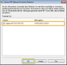 Du måste göra vissa förberedelser för att kunna använda enheten som skanner, däribland installera program på datorn. Mer information finns i handboken som tillhör skrivardrivrutinen på webbsidan med onlinehandböcker. När du ansluter enheten till datorn i Windows via ett trådlöst eller trådbundet LAN måste du först registrera enheten i "MF Network Scanner Selector" enligt nedan. Det behövs inte om enheten och datorn ansluts via USB.