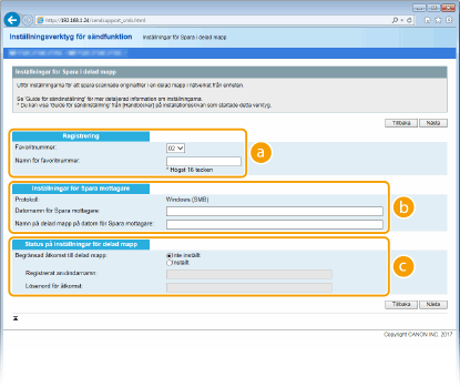 Konfigurera SMB). Om du vill konfigurera enheten så att skannade dokument sparas i en delad mapp i nätverket via SMB anger du platsen för den delade mappen från en dator i förväg. I det här avsnittet beskrivs hur du anger lagringsplats med hjälp av Inställningsverktyg för sändfunktion.