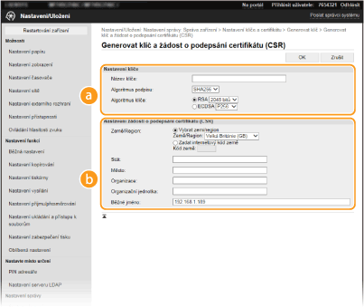 Protože certifikáty vygenerované na zařízení nemají podpis CA, může při komunikaci s některými zařízeními dojít k chybě komunikace. Aby certifikační autorita vydala certifikát s podpisem CA, musíte získat data žádosti o podepsání certifikátu (CSR), kterou může správce vygenerovat ze Vzdáleného uživatelského rozhraní. Po vydání certifikátu ho zaregistrujte do klíče, u kterého jste CSR vygenerovali.