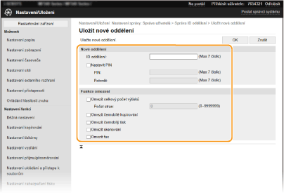 Uložte ID oddělení a nastavte pro ně kód PIN. Uložte všechna ID oddělení, která chcete spravovat.