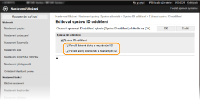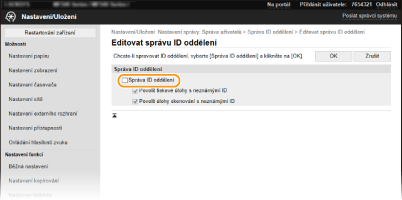 Zaškrtnutím políčka aktivujte správu ID oddělení. Pokud funkci správy ID oddělení nechcete dále používat, zrušte zaškrtnutí políčka.