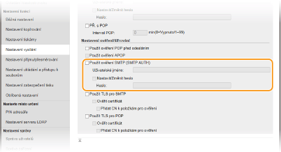 Pokud nakonfigurujete ověřování SMTP (SMTP AUTH), provádí se při odesílání e-mailů či i-faxů identifikace uživatele podle uživatelského jména a hesla.