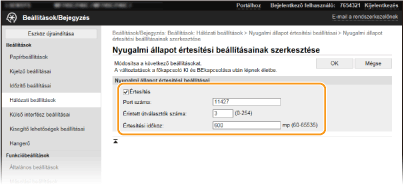 A jelölőnégyzet bejelölésével értesíthet egy eszközfelügyeleti szoftvert a készülék üzemállapotáról. Ha az [Értesítés] jelölőnégyzet be van jelölve, akkor a készülék alvó üzemmódban várhatóan elkerüli a felesleges kommunikációt, és csökkenti a teljes energiafogyasztást. [Port száma]
