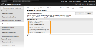 Zaznaczenie tego pola wyboru umożliwia uzyskanie informacji o urządzeniu przez komputer za pomocą interfejsu WSD. To pole wyboru jest zaznaczane automatycznie po zaznaczeniu pola wyboru [Użyj drukowania WSD]. [Użyj skanowania WSD]