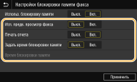 Одновременно задать <Исп. предв. просмотр факса> и <Задать время блокировки памяти> невозможно. |