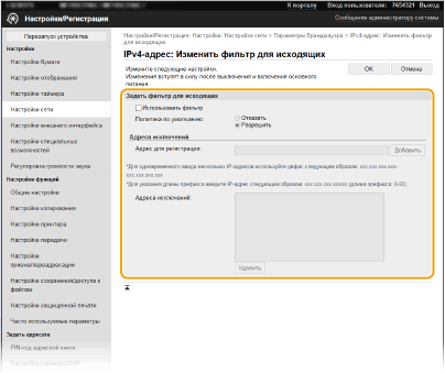 Если для фильтра исходящего трафика выбрано значение [Отказать] Фильтрация исходящих многоадресных и широковещательных пакетов невозможна. Удаление IP-адреса из списка исключений Выберите IP-адрес и нажмите [Удалить]. ![]() | ||||||||||||||