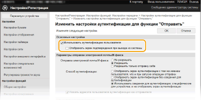 [Использовать сведения для аутентификации, специфические для устройства, и не отображать экран аутентификации] | При отправке электронной почты и интернет-факсов не отображается экран аутентификации. Для авторизации на SMTP-сервере используются имя пользователя и пароль, заданные в разделе [Настройки электронной почты/И-факса] Настройка параметров связи электронной почты/интернет-факса. |