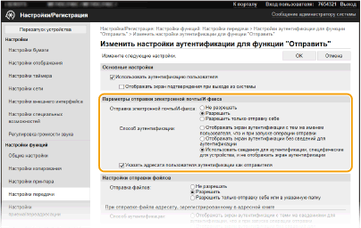 Если значение [Разрешить только отправку себе или в указанную папку] задано в поле [Отправка файлов]