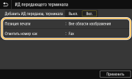 Задает положение для печати данных об идентификаторе терминала в отправляемом факсе. Выберите <Внутри области изображения> для печати данных в области изображения или <Вне области изображения> для печати данных за пределами области изображения.