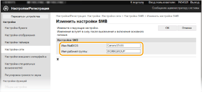 | | SMB (блок сообщений сервера) представляет собой протокол для общего доступа к ресурсам (например, файлам и принтерам) для нескольких устройств в сети. Аппарат использует SMB для сохранения сканированных документов в общую папку. В зависимости от особенностей сети, возможно, потребуется настроить имя NetBIOS и имя рабочей группы. |
