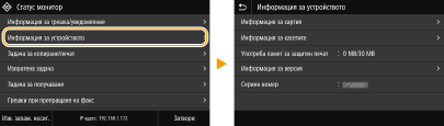 Можете да променяте различни настройки на дисплея, като например езика на показване: <Настр-ки за извеждане> Можете да промените екрана, който се показва автоматично, когато устройството не се използва за определен период от време: <Функция след автоматично нулиране> Можете да промените различни настройки за работата, като например яркостта на дисплея: <Достъпност> |