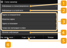 Когато натиснете <Статус монит.>, се показва екран, на който можете да проверите напредъка на документите, състоянието на устройството и мрежовите настройки.