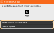 Si es mostra un missatge quan l'equip rep un fax/I-fax o s'estableix la impressió automàtica d'un informe, els faxos/I-faxos rebuts i els informes es desaran a la memòria, la qual cosa evitarà que es mostrin descolorits un cop impresos. Per continuar imprimint encara que la quantitat restant al cartutx de tòner sigui baixa, establiu <Con. imprimint quan cart. baix> en <Activat>. <Con. imprimint quan cart. baix>