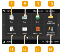![]() | <Copy>Натисніть цю кнопку, щоб почати копіювання. Копіювання <Fax>Натисніть цю кнопку, щоб надіслати факс з апарата. Факс <Scan>Сканує оригінал і перетворює його на електронний файл. Відскановані файли можна зберігати на комп’ютері або надсилати електронною поштою. Сканування <Memory Media Print>Друкує файли, які зберігаються на пристрої USB-пам’яті. Друк із пристрою USB-пам’яті (друк із носія пам’яті) <Secure Print>Використовуйте цю функцію, щоб надрукувати захищений документ. Друк документа, захищеного PIN-кодом (безпечний друк) <Menu>Спочатку потрібно натиснути цю кнопку, щоб перейти до параметрів <Function Settings>, <Preferences> тощо. Список меню параметрів <Address Book>Використовуйте для реєстрації або редагування адресатів електронної пошти та факсів. Також можна відобразити інформацію про зареєстрованого адресата під час надсилання електронного листа або факсу. Реєстрація адресатів <Application Library Guide>Відображає опис програми Application Library (Бібліотека прикладних програм). |