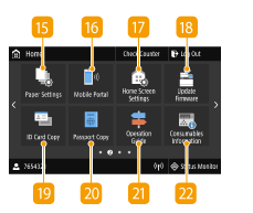 ![]() | <Paper Settings>За допомогою цієї кнопки можна вказати формат і тип паперу, який завантажується до шухляди для паперу та багатофункціонального лотка. Встановлення формату та типу паперу <Mobile Portal>Використовуйте цей елемент, щоб установити підключення до мобільного пристрою. Встановлення зв’язку з мобільними пристроями <Home Screen Settings>Дає змогу змінити порядок розташування кнопок на екрані Home Налаштування екрана Home <Update Firmware>Дає змогу оновити мікропрограми через Інтернет. Оновлення мікропрограми <ID Card Copy>Використовуйте цю функцію для копіювання, під час якого лицева та зворотна сторони водійських прав або інших посвідчень будуть надруковані на одній сторінці. Копіювання посвідчення <Passport Copy>Для копіювання кількох сторінок паспорта на одному аркуші. Копіювання паспорта <Operation Guide>Натисніть цю клавішу, щоб переглянути інструкції щодо використання апарата або пояснення можливих причин помилок і шляхів їх усунення. |
