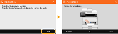 У деяких випадках у разі виникнення помилок на екрані відображаються інструкції з їх усунення. Для вирішення проблеми дотримуйтесь інструкцій, що з’являться на екрані. Нижче для прикладу наведено зображення екрана, який відображається, коли сталося зминання паперу.