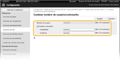 Marque la casilla de verificación [Usar IEEE 802.1X] e introduzca el nombre de inicio de sesión en el cuadro de texto [Nombre de inicio sesión].