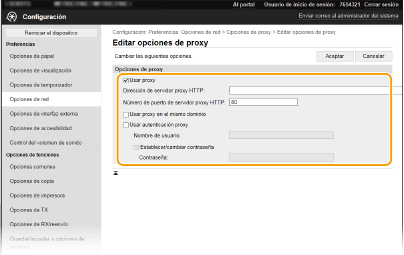 Seleccione la casilla de verificación [Usar proxy] y especifique las opciones necesarias.