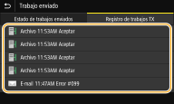 Para consultar los registros de los documentos enviados1 | Seleccione el documento cuyo registro desea comprobar en la pestaña <Registro de trabajos TX>. <Aceptar> aparece cuando se ha enviado un documento correctamente, y <Error> aparece cuando un documento no se ha podido enviar porque se ha cancelado o se ha producido algún error. ![]() Se muestra la información detallada del documento. ![]() Cuando se muestra un número de tres dígitos en el caso de <Error> Este número representa un código de error. Para obtener más información, consulte "Solución de problemas (FAQ)" en el sitio web del manual en línea. Registrar el destino del documento enviado en la Libreta de direcciones Para un documento enviado a un destino no registrado en la Libreta de direcciones, puede registrar ese destino en la Libreta de direcciones seleccionando <Reg. en libr. dir.> en la pantalla de detalles. |
