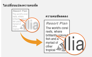 คุณสามารถปรับความคมชัดของภาพที่ทำสำเนา เพิ่มความคมชัดเพื่อให้ข้อความหรือลายเส้นที่เบลอมีความคมชัดมากขึ้น หรือลดความคมชัดลงเพื่อปรับปรุงภาพที่ปรากฏของรูปภาพนิตยสาร