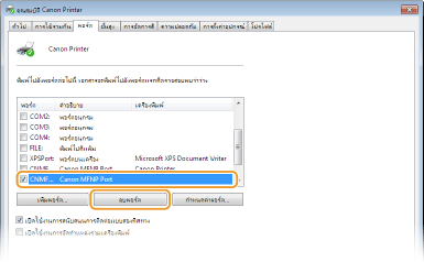 2 | เลือก [Canon MFNP Port] ใน [ชนิดพอร์ตที่มีอยู่] และคลิก [สร้างพอร์ต] |