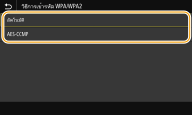2 | เลือกวิธีการเข้ารหัส ![]() <อัตโนมัติ> ตั้งค่าให้เครื่องเลือก AES-CCMP หรือ TKIP โดยอัตโนมัติเพื่อให้ตรงกับการตั้งค่าของเราเตอร์แบบไร้สาย <AES-CCMP> ตั้งค่า AES-CCMP เป็นวิธีการเข้ารหัส |