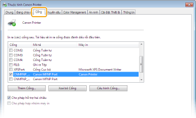 Thêm vào một cổngCổng MFNP (chỉ dành cho môi trường IPv4) | Đây là cổng cho phép phát hiện tự động địa chỉ IP của máy. Cho dù địa chỉ IP của máy có bị thay đổi thì kết nối vẫn được duy trì, với điều kiện máy và máy tính ở cùng mạng con. Bạn không cần phải thêm một cổng mới mỗi khi địa chỉ IP thay đổi. Nếu bạn đang sử dụng máy trong môi trường IPv4, bạn nên chọn loại cổng này. ![]() Bạn chỉ có thể thêm cổng MFNP khi bạn đã cài đặt trình điều khiển từ CD-ROM/DVD-ROM được cung cấp, hoặc khi bạn đã tải xuống và cài đặt trình điều khiển máy in hoặc trình điều khiển máy fax từ trang web Canon. |