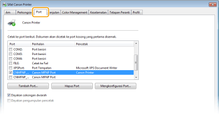 Jika anda menggunakan sambungan rangkaian dan telah menukar alamat IP mesinJika [Description] untuk port yang terpilih adalah [Canon MFNP Port], dan mesin dan komputer berada di subnet yang sama, kemudian sambungan akan dikekalkan. Anda tidak perlu menambah port baru. Jika ia [Standard TCP/IP Port], anda perlu menambah port baru. Mengkonfigurasi Port Pencetak |
