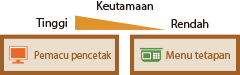 Asterisk (*)Tetapan yang ditandakan dengan "*1" mungkin tidak tersedia atau mempunyai lalai yang berbeza bergantung pada negara atau rantau anda. Tetapan ditanda dengan "*2" mungkin tidak dipaparkan bergantung pada model yang anda gunakan, pilihan, atau lain-lain item tetapan. Tetapan yang ditandakan dengan "*3" tidak boleh diimport atau dieksport. Keutamaan tetapanJika tetapan cetakan ditentukan kedua-duanya dari pemacu pencetak dan panel operasi mesin, spesifikasi dari pemacu pencetak mengatasinya dari panel operasi. Spesifikasi dari panel operasi menjadi berkesan dalam beberapa kes tertentu, seperti apabila melakukan percetakan PS/PCL dan percetakan daripada UNIX atau sistem operasi lain yang tidak menyokong pemacu pencetak. |