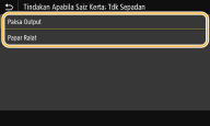 Pilih sama ada percetakan dilakukan mengikut tetapan pemacu pencetak untuk saiz dan jenis kertas mengambil keutamaan ke atas tetapan dibuat untuk setiap sumber kertas di bawah <Tetapan Kertas> dalam skrin Rumah. Dengan memilih <Aktif>, anda boleh mencetak dari sumber kertas yang dinyatakan di dalam pemacu pencetak, tanpa mengira tetapan kertas pada mesin. Mesej ralat boleh ditetapkan untuk memaparkan jika saiz kertas dimuatkan adalah sebahagian besarnya berbeza daripada yang ditetapkan dalam pemacu pencetak.