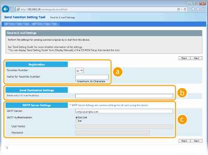 Send Function Setting Tool (Model Disokong Sahaja) membantu anda mengkonfigurasi tetapan asas untuk menghantar e-mel. Berbanding Send Function Setting Tool (Model Disokong Sahaja), anda boleh menggunakan Remote UI untuk mengkonfigurasi tetapan dengan lebih terperinci seperti tetapan untuk pengesahan POP sebelum penghantaran atau untuk komunikasi yang disulitkan. Mengkonfigurasi Tetapan Komunikasi E-Mel/I-Faks |
