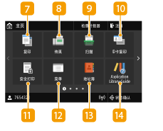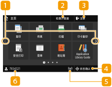 ![]() | <纸张设置>此按钮可用于指定纸盒和多功能托盘中装入的纸张的尺寸和类型。 指定纸张尺寸和类型 <移动门户>使用此按钮可与移动设备建立连接。 与移动设备连接 <主页屏幕设置>能够更改主页画面按钮的显示顺序。自定义主页画面 <更新固件>您可以通过互联网更新固件。 更新固件 <存储介质打印>打印存储在 USB 存储设备中的文件。 从 USB 存储设备打印(存储介质打印) <护照复印>支持在一张纸上复印多本护照。复印护照 <操作指南>按下可查看操作指南和错误原因/解决方法。 |