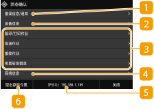 按下 <状态确认> 时,将显示一个画面,可供您检查文档进度,以及本机状态和等网络设置信息。